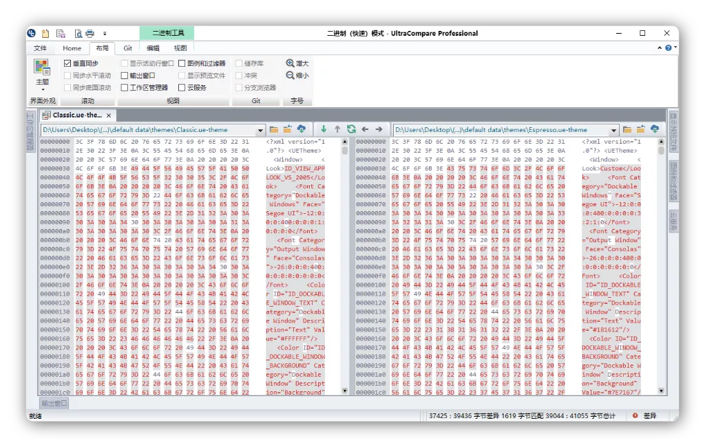 UltraCompare支持二进制内容比较,因此您可以使用 UltraCompare 比较任何格式的文件。例如通过比较 exe 程序或 apk 应用文件,研究破解版与原版的区别差异。