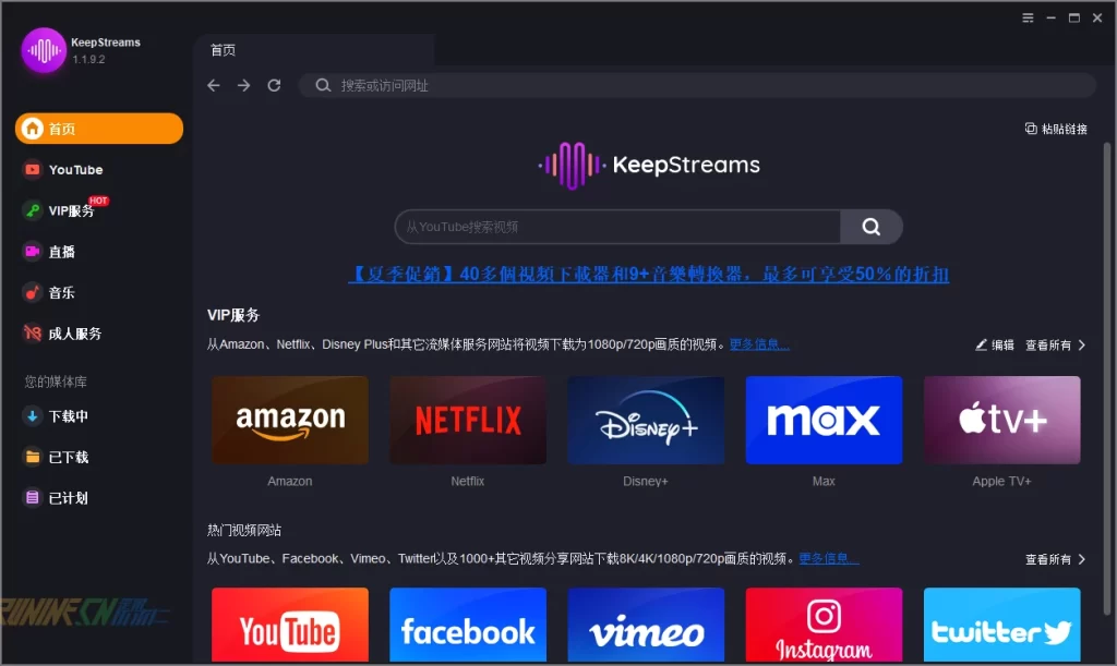 KeepStreams 中文破解版 由歪果不求仁(www.wgbqr.com)整理发布. KeepStreams是一款功能强大的在线视频音频下载工具,它能够帮助用户从各种视频分享网站上下载视频并保存到本地。支持下载的视频网站非常广泛,包括知名的视频分享网站如YouTube、Amazon、Netflix、Disney+、TikTok、Instagram、Facebook、Twitter等等。不仅如此,它还支持国内外各大视频平台,如爱奇艺、腾讯视频、优酷、芒果TV等等。无论是国内还是国外的视频,KeepStreams都能轻松应对,让用户畅快地下载自己喜欢的视频内容。