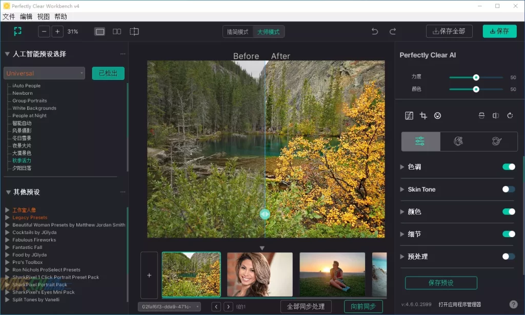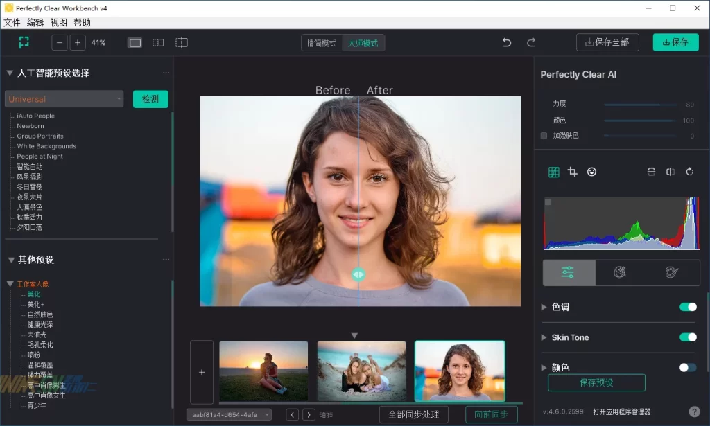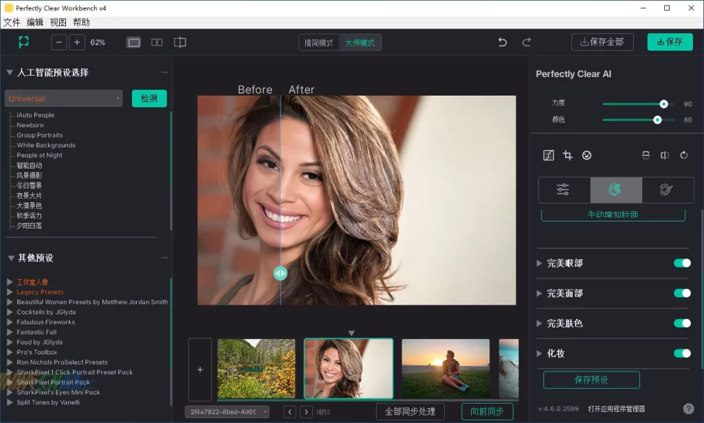 Perfectly Clear Workbench 中文破解版 由歪果不求仁(www.wgbqr.com)整理发布. Perfectly Clear Workbench 是全球领先的自动图像校正基于人工智能图像处理软件,自动图像增强软件。主要用于去除图像中的杂色和提高图像质量。吸取了20多年的真实科学经验,并将其与尖端的人工智能相结合,创造了市场上最好的自动视频和AI图像校正技术。它提供了一系列的图像智能处理工具,如颜色校正、人像修饰、图像增强、图像降噪、去除杂色、自动裁剪、对比度调整、创意滤镜等,帮助用户轻松地优化图像。Perfectly Clear Workbench 适用于摄影师、设计师和其他需要处理大量图像的用户。
