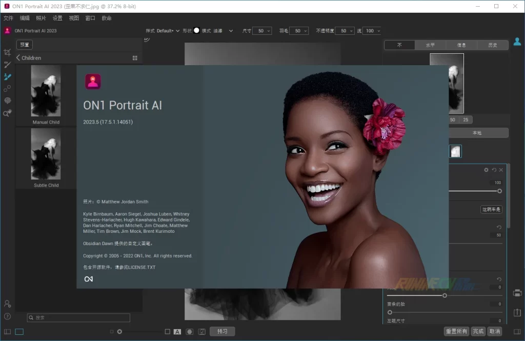 ON1 Portrait AI中文破解版 由歪果不求仁(www.wgbqr.com)整理发布. ON1 Portrait AI是一款人像AI编辑和修饰工具,更简单的AI图片修饰,使用我们的肖像编辑软件 ON1 Portrait AI,只需点击一下即可实现完美修饰。我们的肖像照片编辑软件使用机器学习来查找照片中的每一张脸,并自动使它们看起来很棒。它会分析每张脸,并对皮肤、眼睛和嘴巴添加适量的修饰,立即为您提供专业的效果。