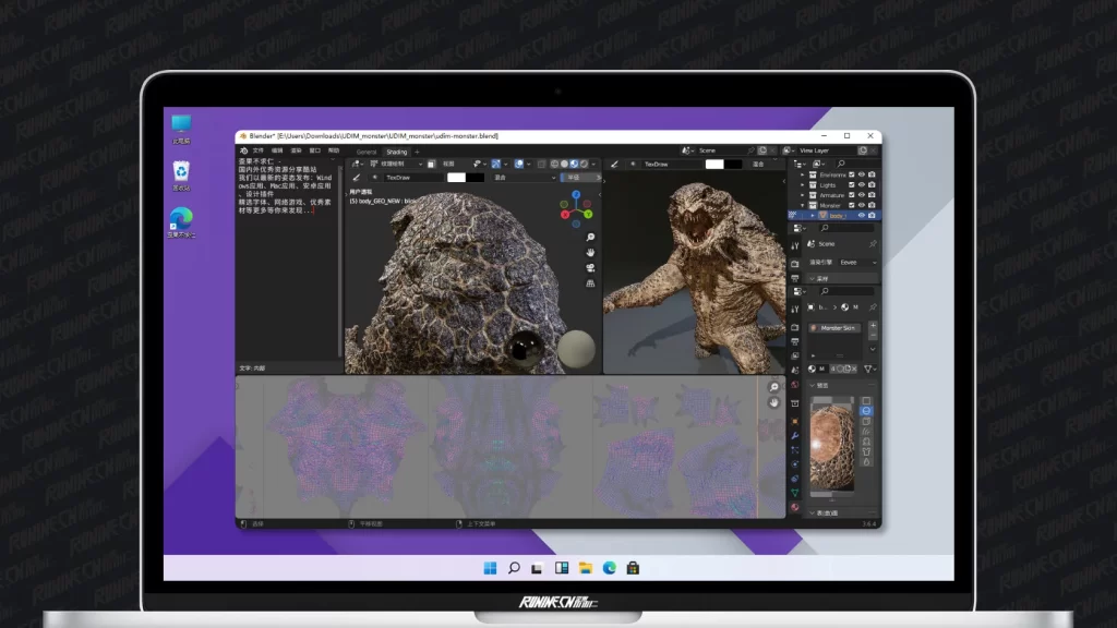 Blender内置了强大的渲染引擎Cycles和实时渲染引擎Eevee,可以高效地渲染出逼真的图像和动画。