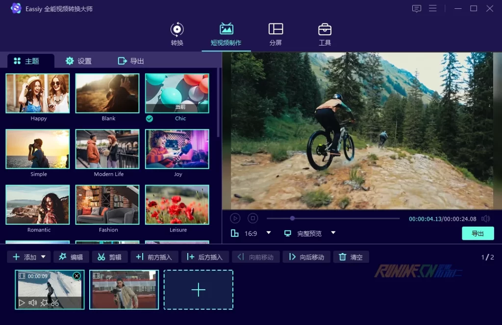 合并视频:将不同的剪辑合并为一个片段,或轻松组合社交媒体的剪辑。灵活直观地调整视频的位置。轻松快速地添加视频的介绍和结尾。