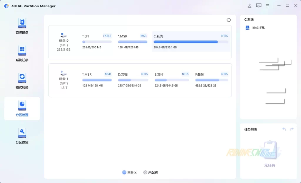 4DDiG Partition Manager中文破解版 由歪果不求仁(www.wgbqr.com)整理发布. 4DDiG Partition Manager是一款全功能的磁盘分区管理软件。它提供了易于使用的工具和界面,可帮助用户对硬盘进行分区、合并、调整大小和格式化等操作。该软件支持多种文件系统,包括NTFS、FAT32、exFAT和EXT等,使用户能够根据自己的需求进行灵活的分区设置。除了分区管理,4DDiG Partition Manager还提供数据恢复功能,可以帮助用户快速找回误删除或丢失的分区数据。此外,该软件还具备备份和克隆磁盘的能力,方便用户在需要时进行数据迁移或备份。总体而言,4DDiG Partition Manager是一个功能齐全的磁盘分区管理工具,提供了多种实用功能,帮助用户有效管理和维护硬盘分区。