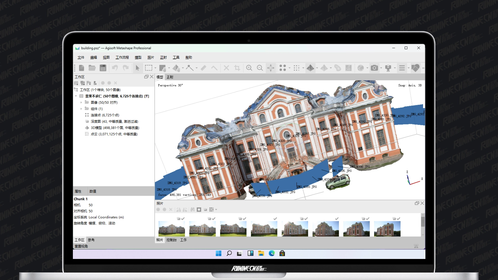 Metashape能够自动执行图像预处理、空中三角测量、点云生成、点云分类和三维模型重建等任务。