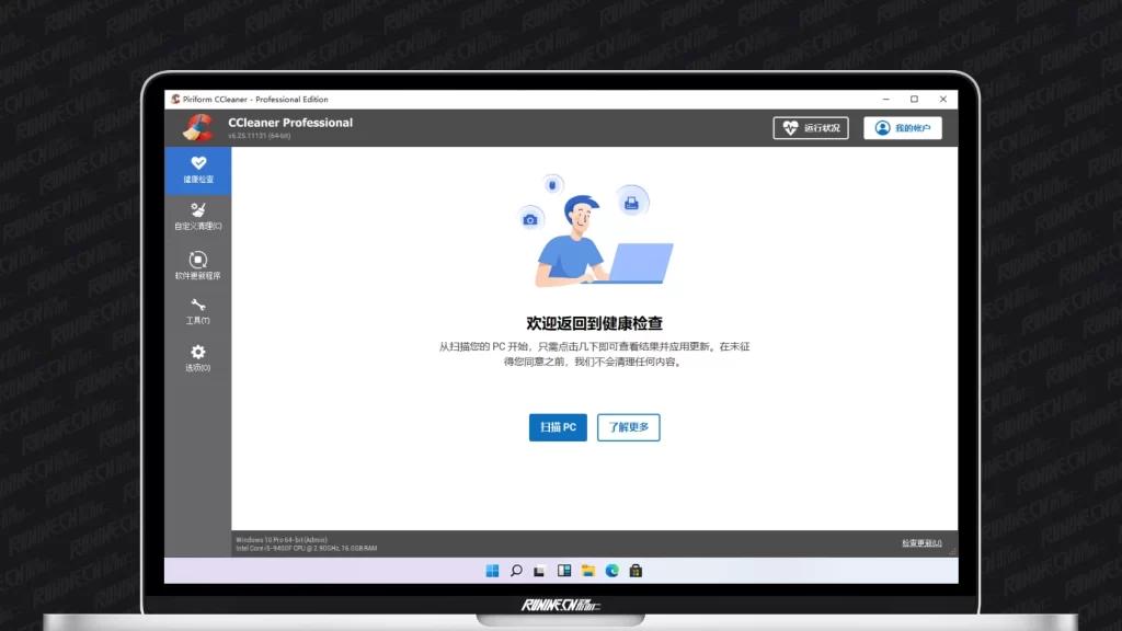 CCleaner 的新健康检查功能会分析您的 PC,并建议快速修复,然后自动调整和更新,使其启动和运行速度更快、更安全