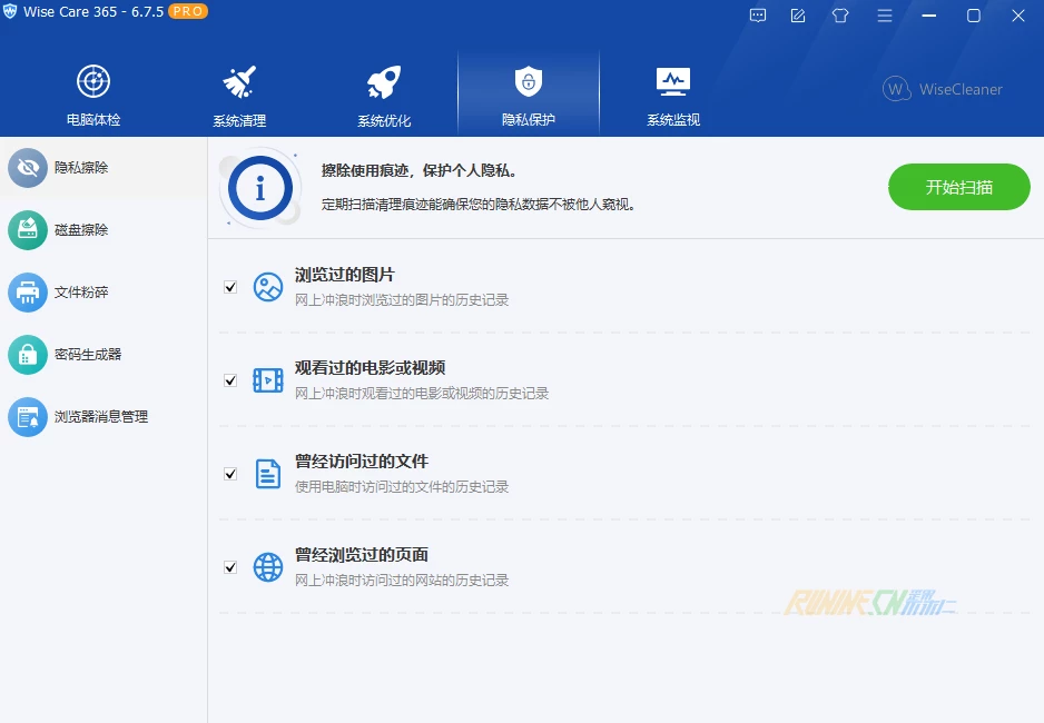 Wise Care 365 Pro 中文破解版 由歪果不求仁(www.wgbqr.com)整理发布. Wise Care 365 Pro 是一款专业的 Windows 系统清理和优化软件。它具有强大的清理功能,可以清除无效的注册表条目、无用的文件、下载历史、浏览历史、无效的捷径、痕迹、缓存、密码等,释放硬盘空间,提高系统运行速度。此外,该软件还具备系统体检、系统清理、系统优化等功能,帮助用户维护电脑系统的最佳状态。